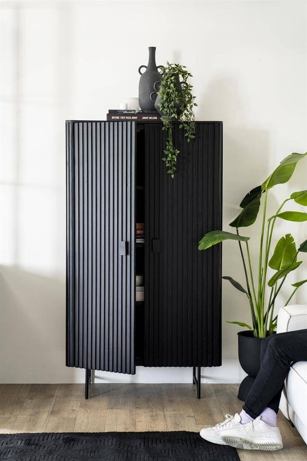 Materiaal: Mango hout & metaalAfmeting: 96 x 45 x 170 cmInfo: 2 deuren | 3 planken achter elke deur ( 39,5cm diep )Afstand tussen planken: 34 cmPoothoogte: 20 cmAfwerking: GelaktKleur: ZwartMonteren: Ja, poten en greepjes monteren