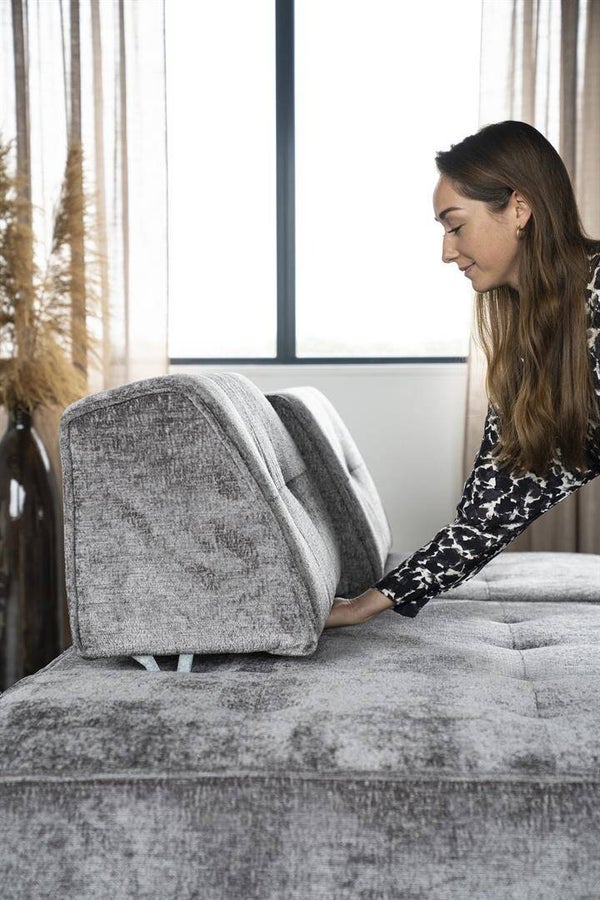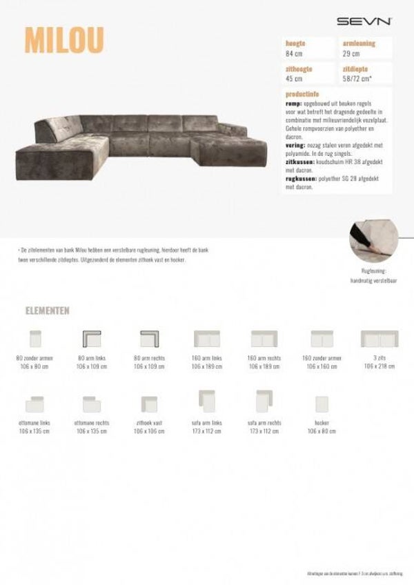 * De zitelementen van bank Milou hebben een verstelbare rugleuning, hierdoor heeft de bank twee verschillende zitdieptes. Uitgezonderd de elementen zithoek vast en hocker.