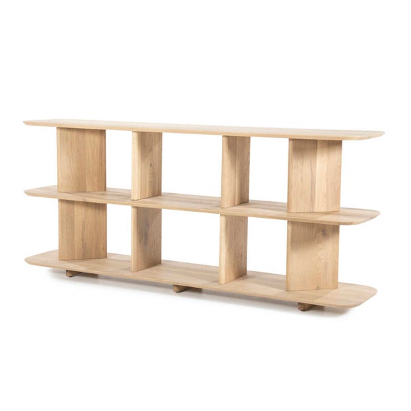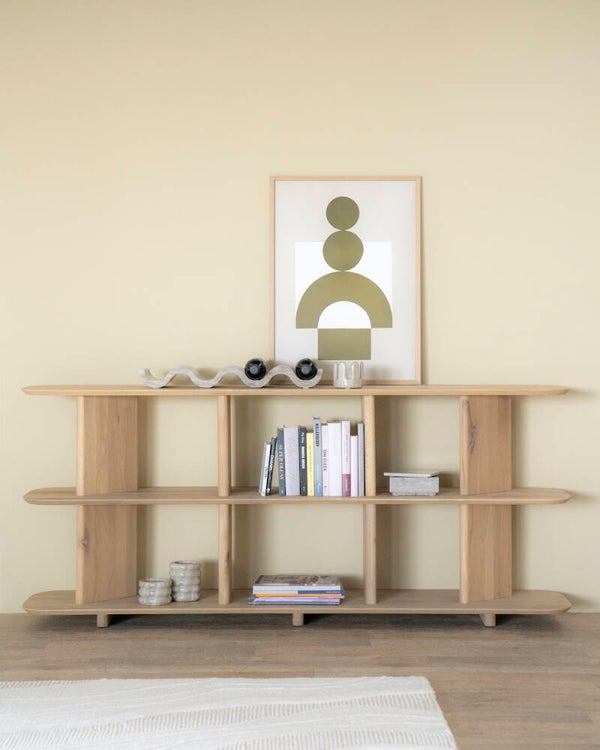 Materiaal: EikenhoutAfmeting: 180 x 40 x 80 cmInfo: 3 plankenAfstand tussen planken: 33,5 cmBxD open vakken: links / rechts 27,5 x 25 cmMidden: 45 x 25 cmAfwerking: GelaktMonteren: -Onderhoud: Schoonmaken met een vochtige/droge doek