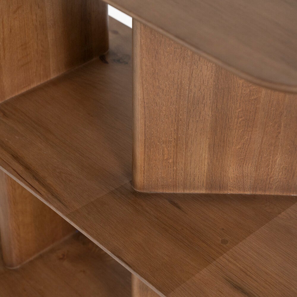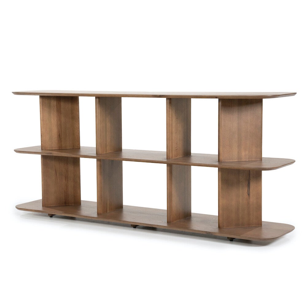 Materiaal: EikenhoutAfmeting: 180 x 40 x 80 cmInfo: 3 plankenAfstand tussen planken: 33,5 cmBxD open vakken: links / rechts 27,5 x 25 cmMidden: 45 x 25 cmAfwerking: GelaktMonteren: -Onderhoud: Schoonmaken met een vochtige/droge doek