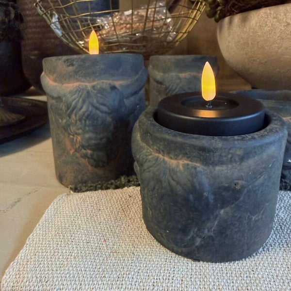Materiaal: SteenKleur: GrijsAfmeting: s) 7,5x9,5cm, m) 11,5x9,5cmincl. 2 grote ledwaxines*let op je besteld de volledige set